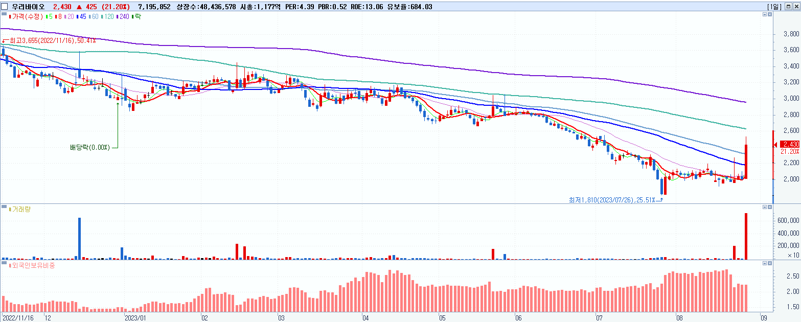 - 우리바이오 (2,430원 ▲ 21.2% , 시총: 1,177억, 거래량: 7,213,191, 거래대금:170억)