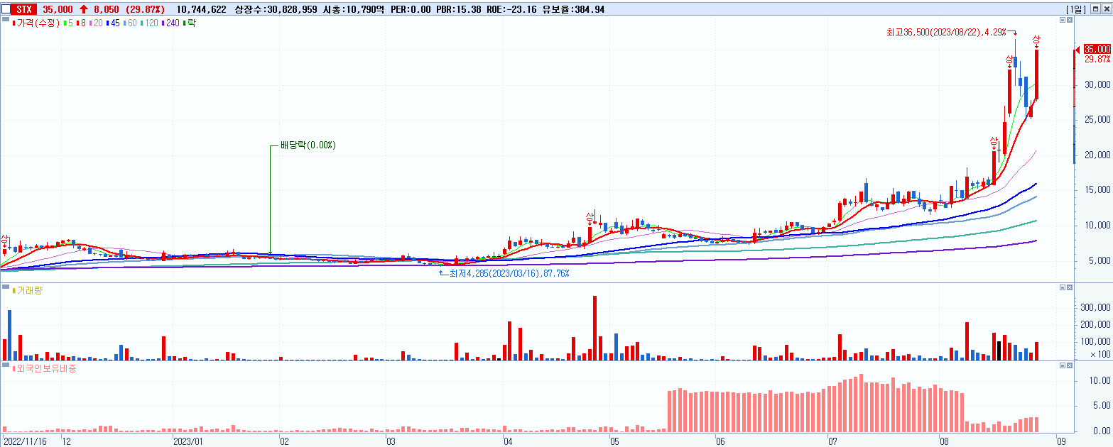 - STX (35,000원 ▲ 29.87% , 시총: 10,790억, 거래량: 10,747,232, 거래대금:3,484억)
