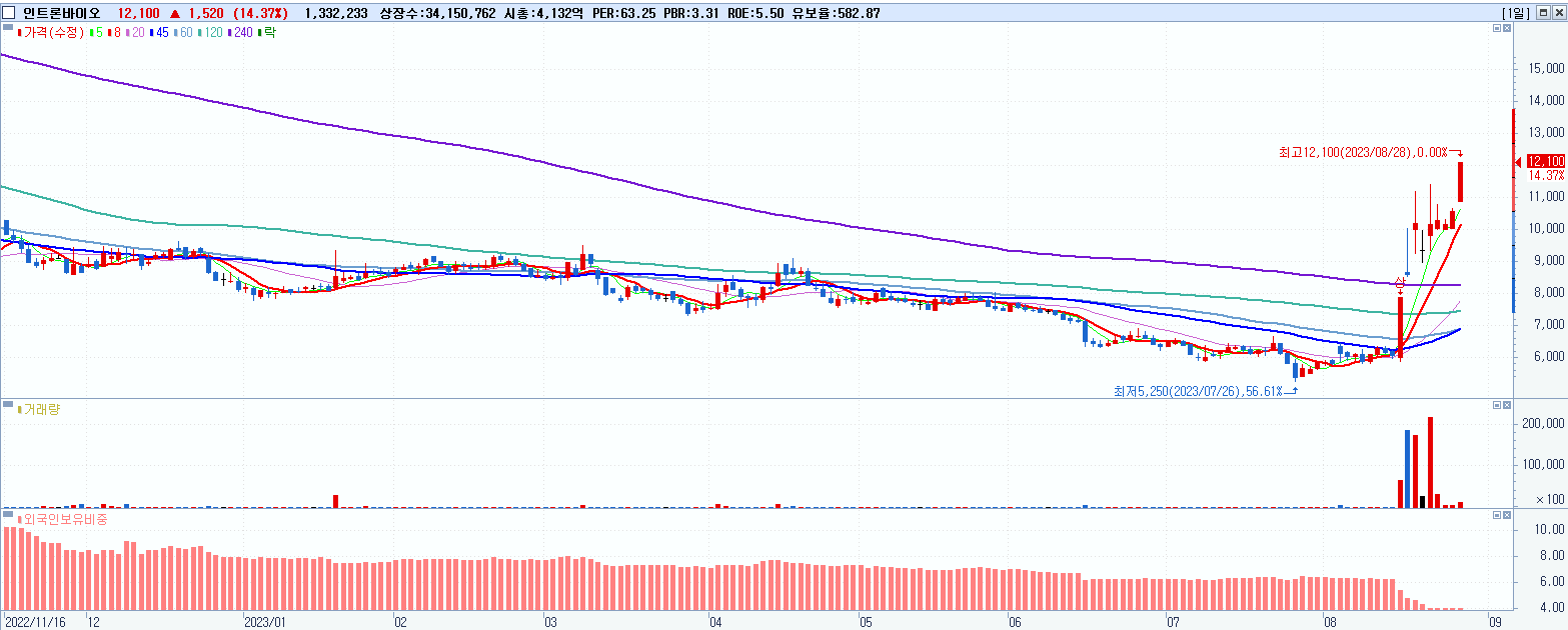 - 인트론바이오 (12,100원 ▲ 14.37% , 시총: 4,132억, 거래량: 1,332,233, 거래대금:154억)