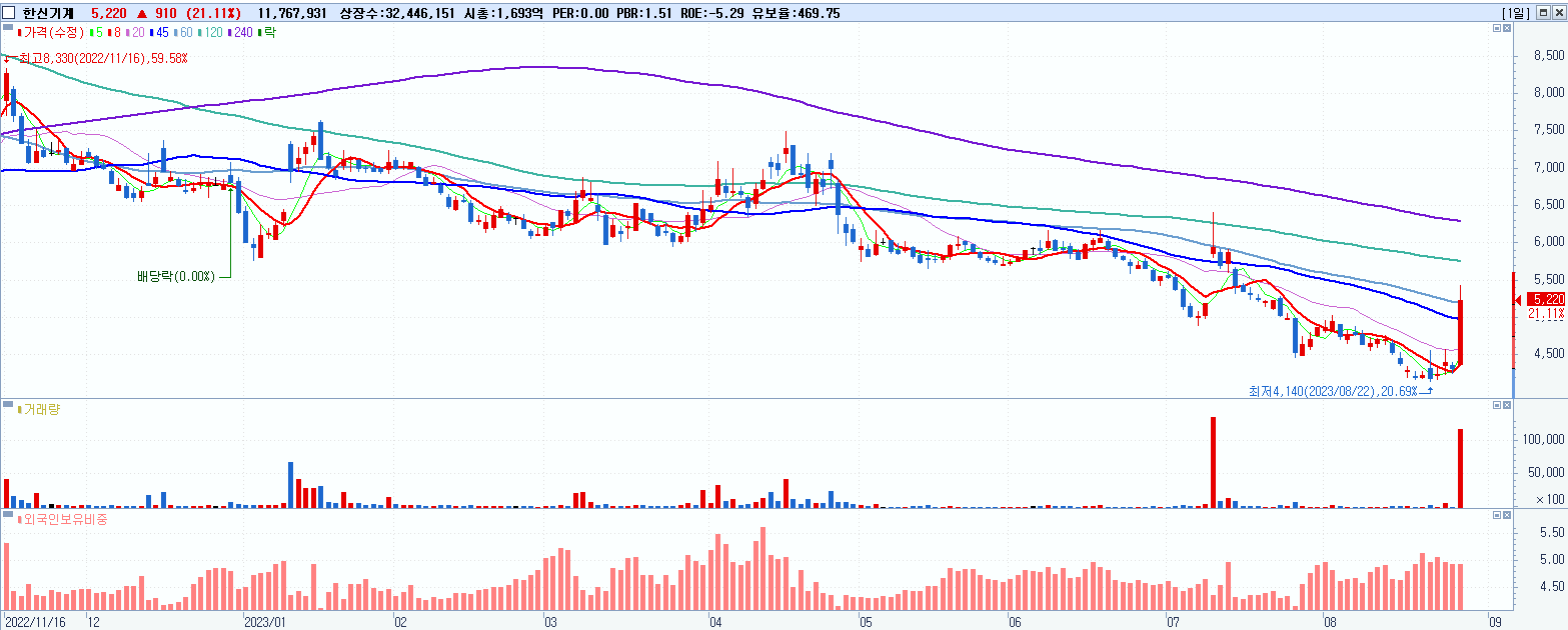 - 한신기계 (5,220원 ▲ 21.11% , 시총: 1,694억, 거래량: 11,880,788, 거래대금:608억)