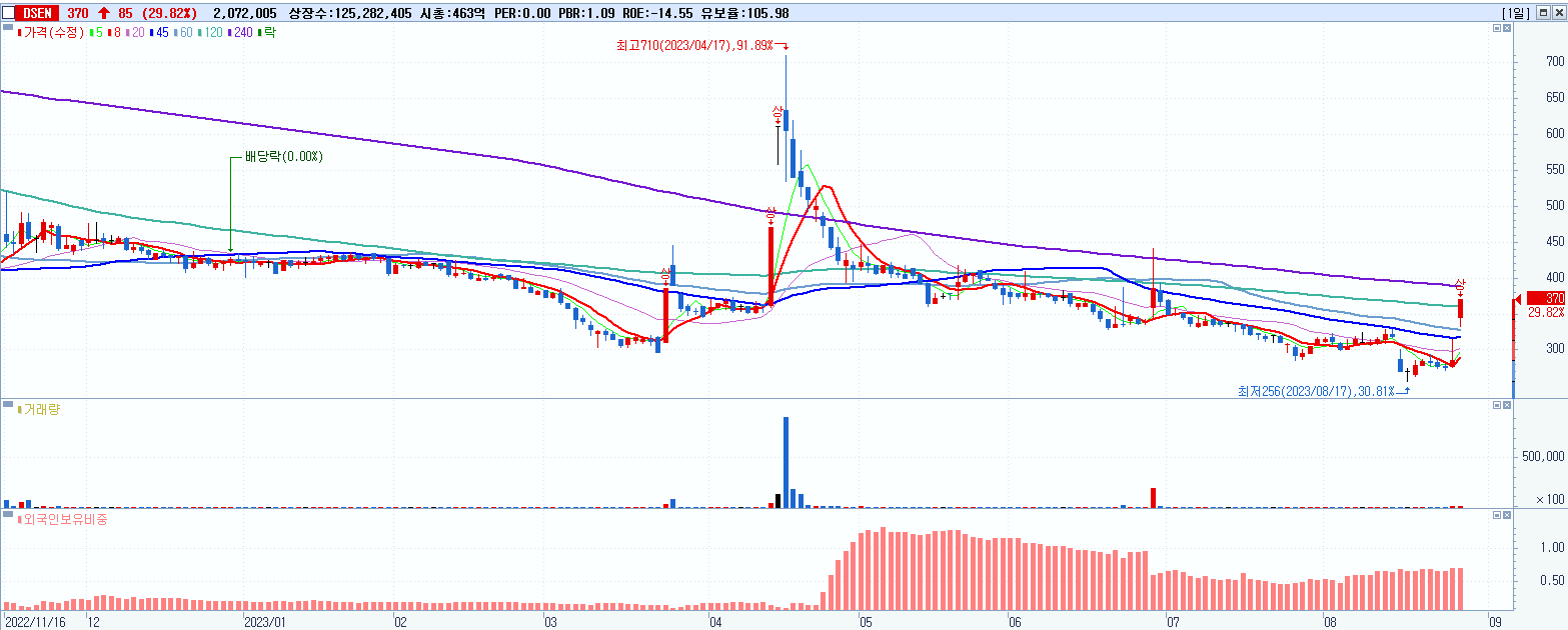- DSEN (370원 ▲ 29.82% , 시총: 464억, 거래량: 2,072,005, 거래대금:7억)