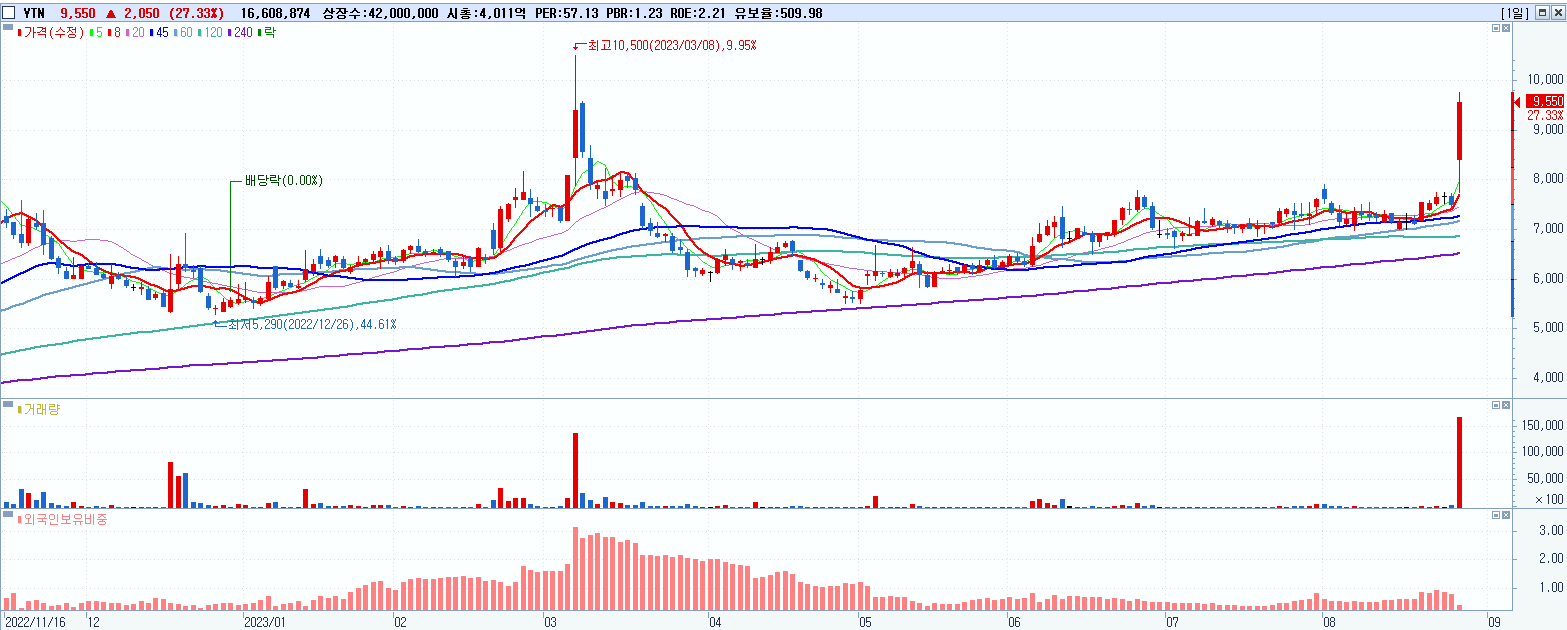 - YTN (9,550원 ▲ 27.33% , 시총: 4,011억, 거래량: 16,645,723, 거래대금:1,510억)