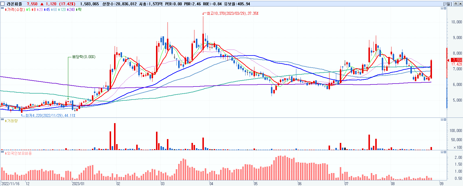 - 라온피플 (7,550원 ▲ 17.42% , 시총: 1,573억, 거래량: 1,584,809, 거래대금:116억)