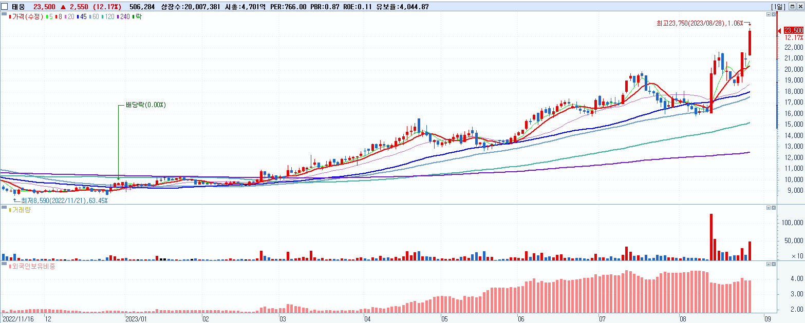 - 태웅 (23,500원 ▲ 12.17% , 시총: 4,702억, 거래량: 506,339, 거래대금:116억)