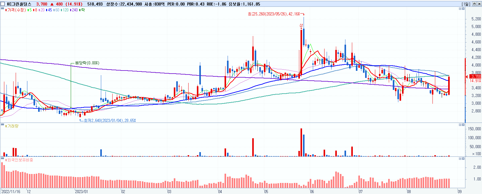 - KC그린홀딩스 (3,700원 ▲ 14.91% , 시총: 830억, 거래량: 530,309, 거래대금:19억)