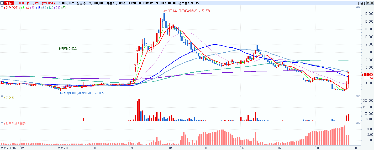- 레몬 (5,090원 ▲ 29.85% , 시총: 1,883억, 거래량: 9,808,028, 거래대금:465억)