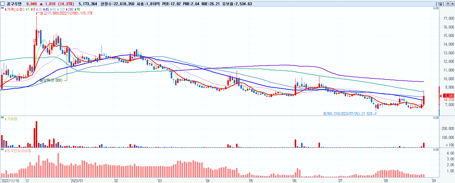 - 공구우먼 (8,040원 ▲ 14.37% , 시총: 1,819억, 거래량: 5,191,856, 거래대금:425억)