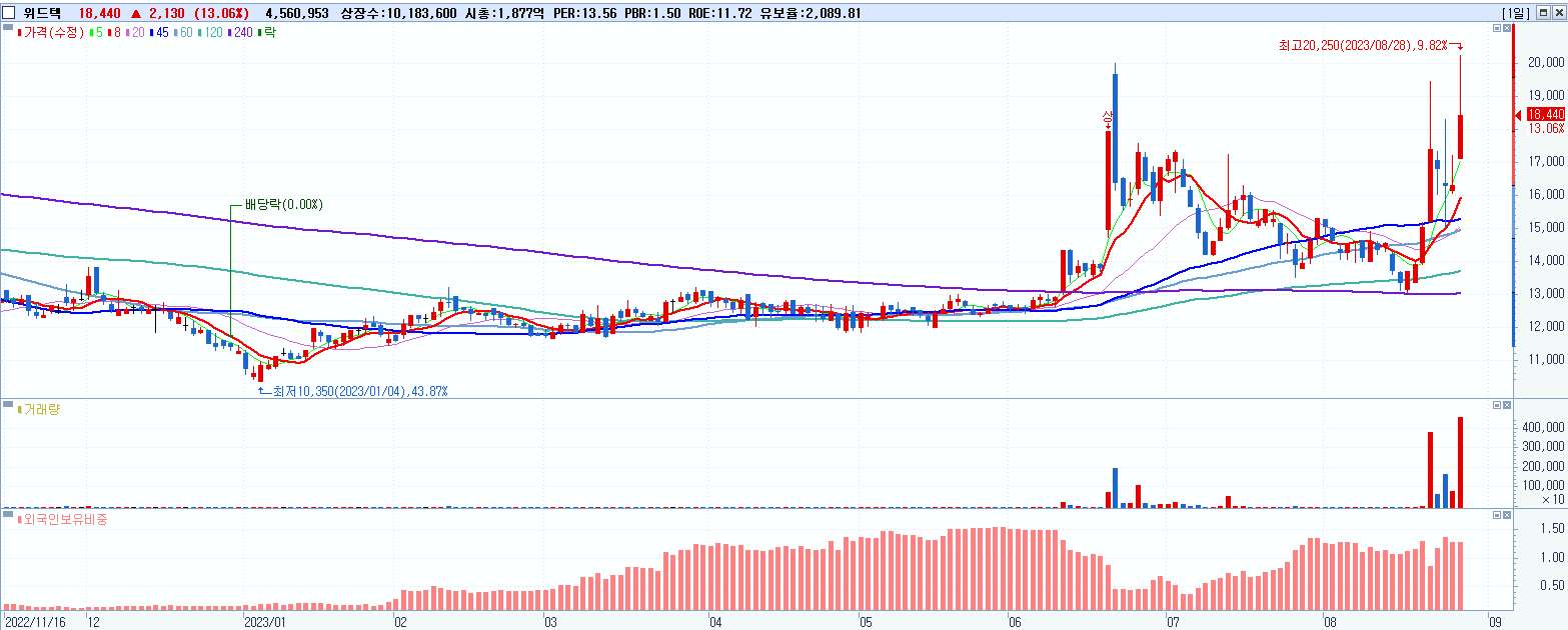 - 위드텍 (18,440원 ▲ 13.06% , 시총: 1,878억, 거래량: 4,569,231, 거래대금:871억)
