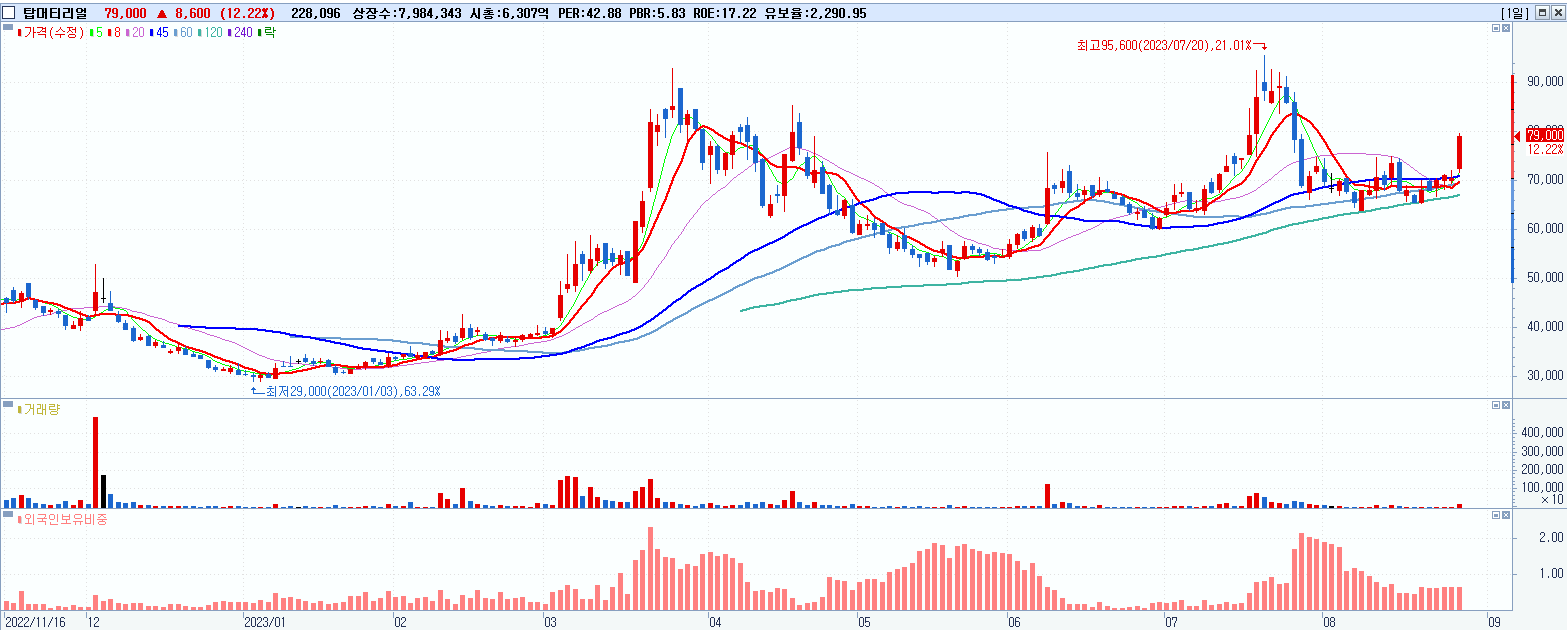 - 탑머티리얼 (79,000원 ▲ 12.22% , 시총: 6,308억, 거래량: 228,246, 거래대금:174억)