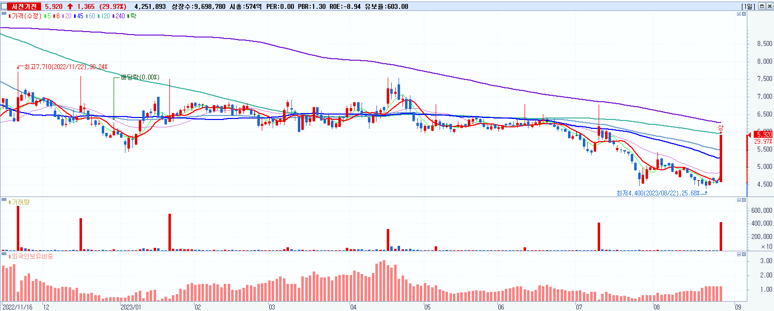 - 서전기전 (5,920원 ▲ 29.97% , 시총: 574억, 거래량: 4,252,149, 거래대금:236억)