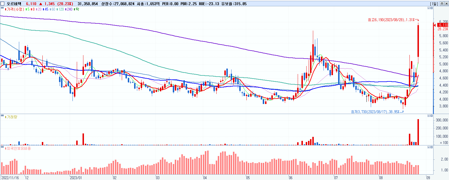 - 오르비텍 (6,110원 ▲ 28.23% , 시총: 1,654억, 거래량: 31,384,199, 거래대금:1,866억)