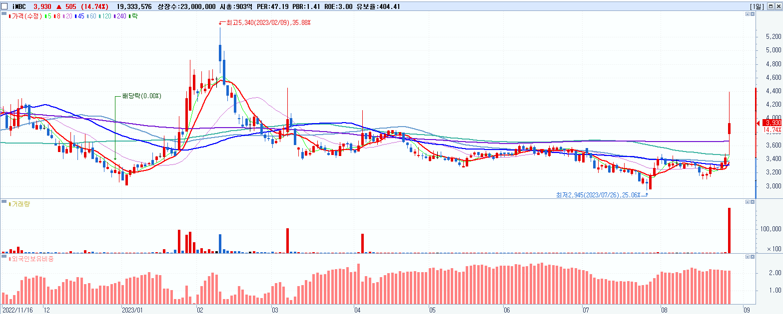 - iMBC (3,930원 ▲ 14.74% , 시총: 904억, 거래량: 19,383,395, 거래대금:778억)