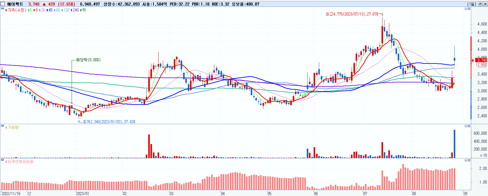 - 에이팩트 (3,740원 ▲ 12.65% , 시총: 1,584억, 거래량: 6,970,619, 거래대금:271억)