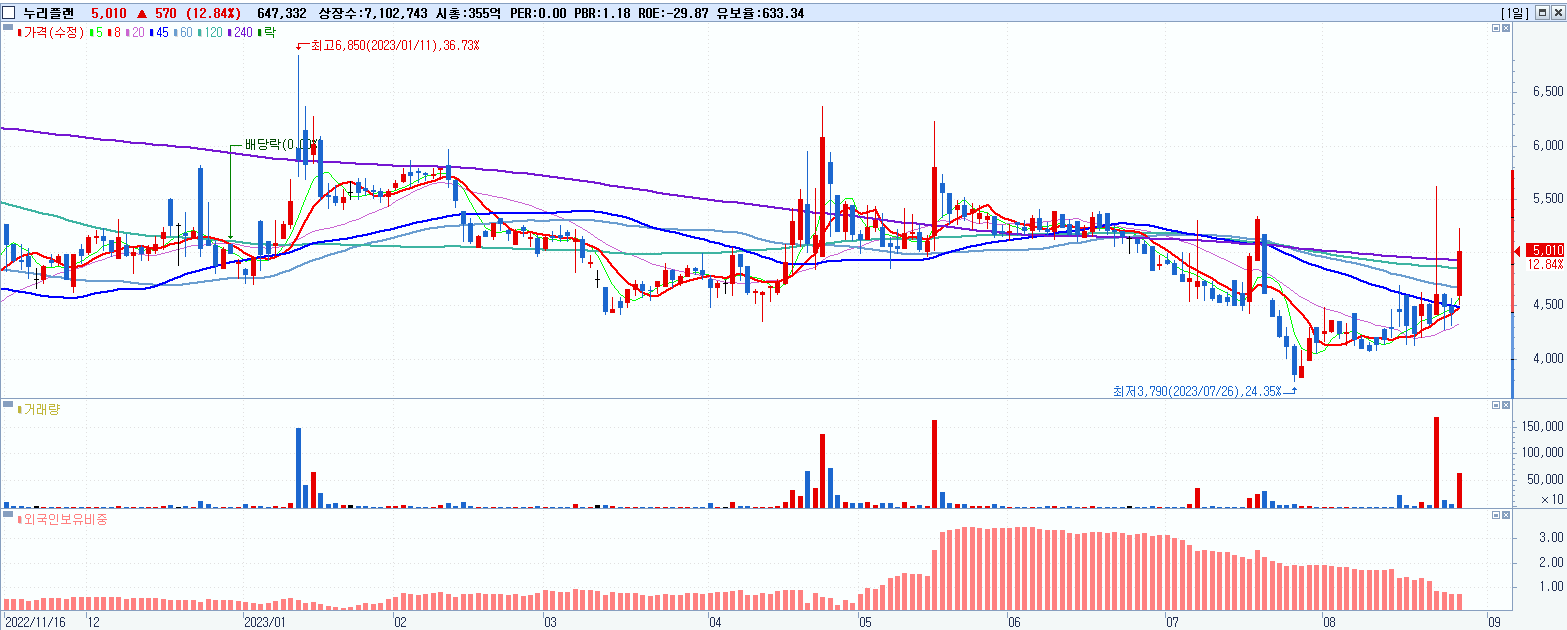 - 누리플랜 (5,010원 ▲ 12.84% , 시총: 356억, 거래량: 647,348, 거래대금:32억)