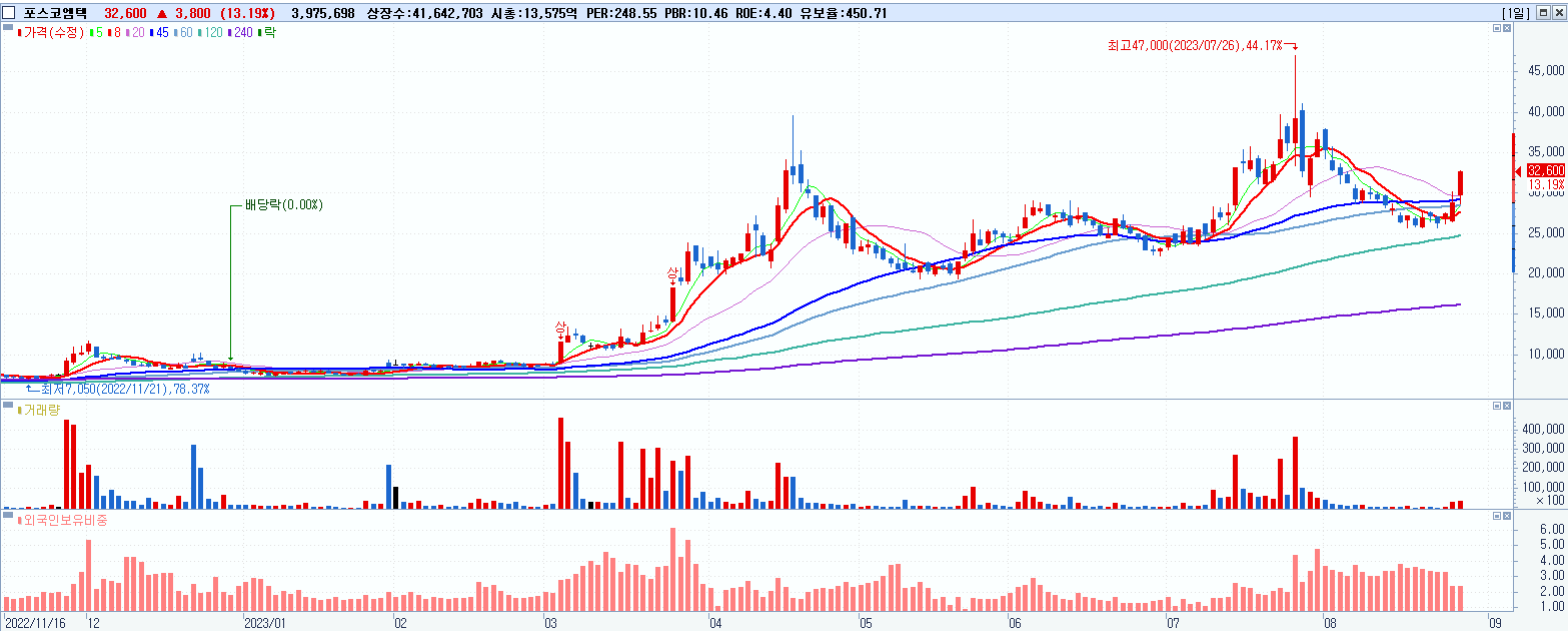 - 포스코엠텍 (32,600원 ▲ 13.19% , 시총: 13,576억, 거래량: 3,989,278, 거래대금:1,228억)