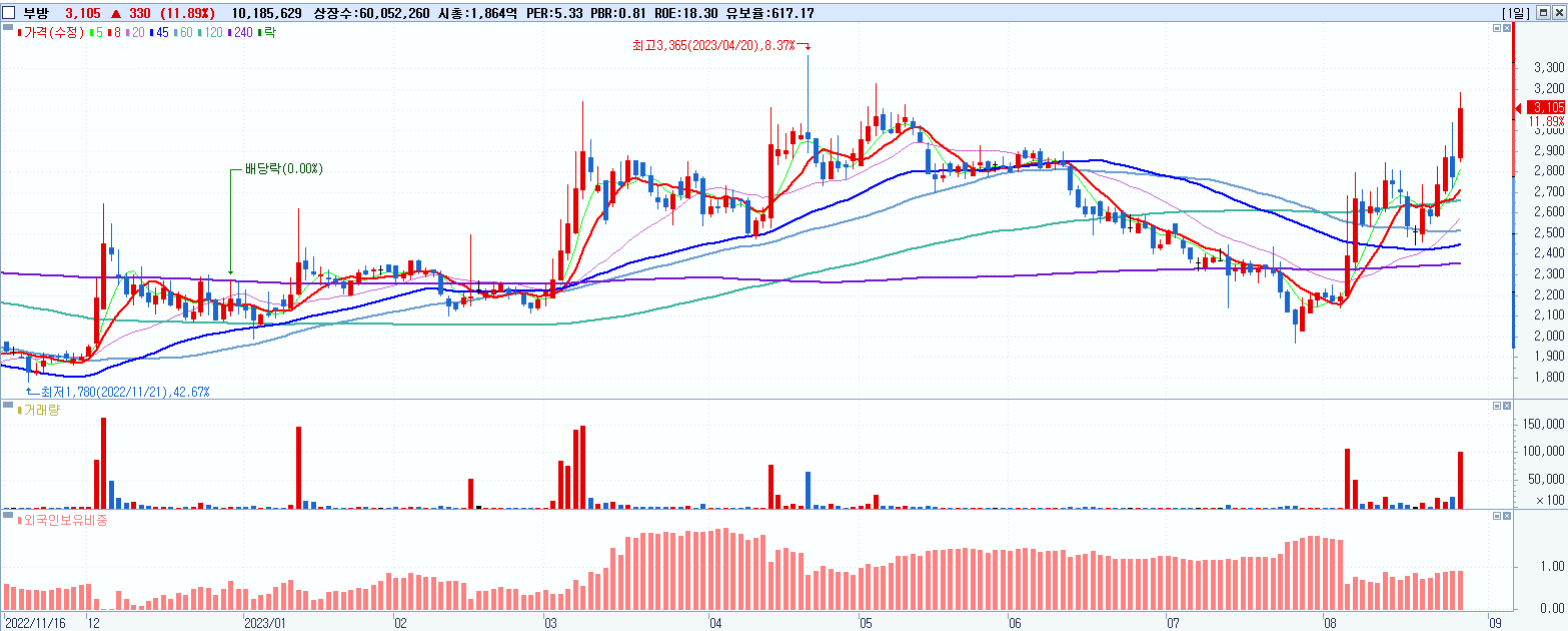 - 부방 (3,105원 ▲ 11.89% , 시총: 1,865억, 거래량: 10,187,106, 거래대금:312억)