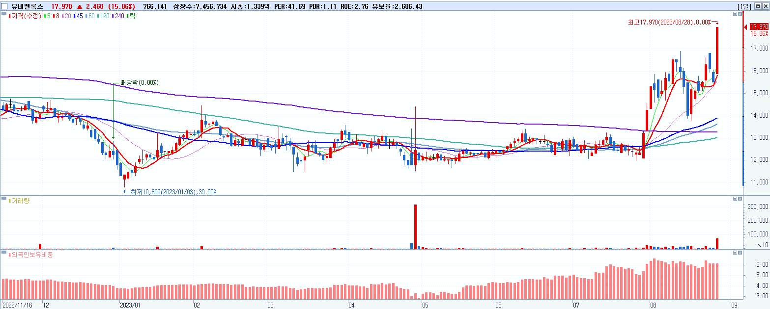 - 유비벨록스 (17,970원 ▲ 15.86% , 시총: 1,340억, 거래량: 767,132, 거래대금:132억)