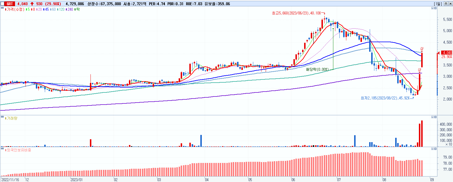 4.GRT 4,040원 ▲ 29.9% (KOSDAQ, 900290)