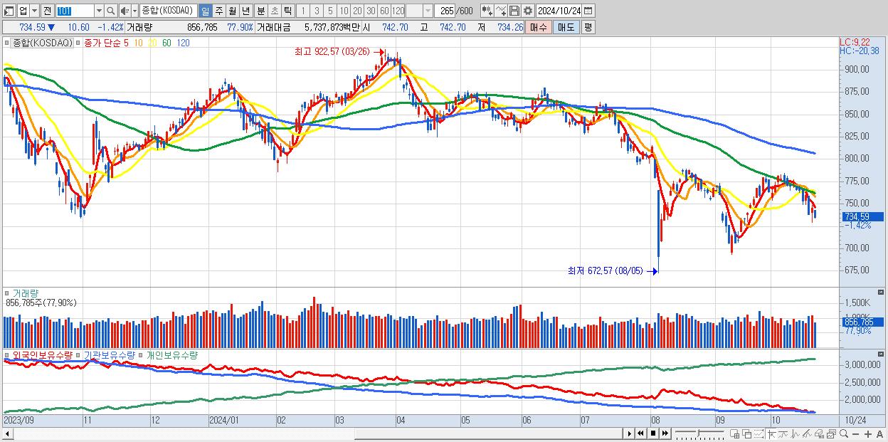 10/24 | 734.59 | ▼-1.42% | 1,758억 | -746억 | -923억 | -90억 |