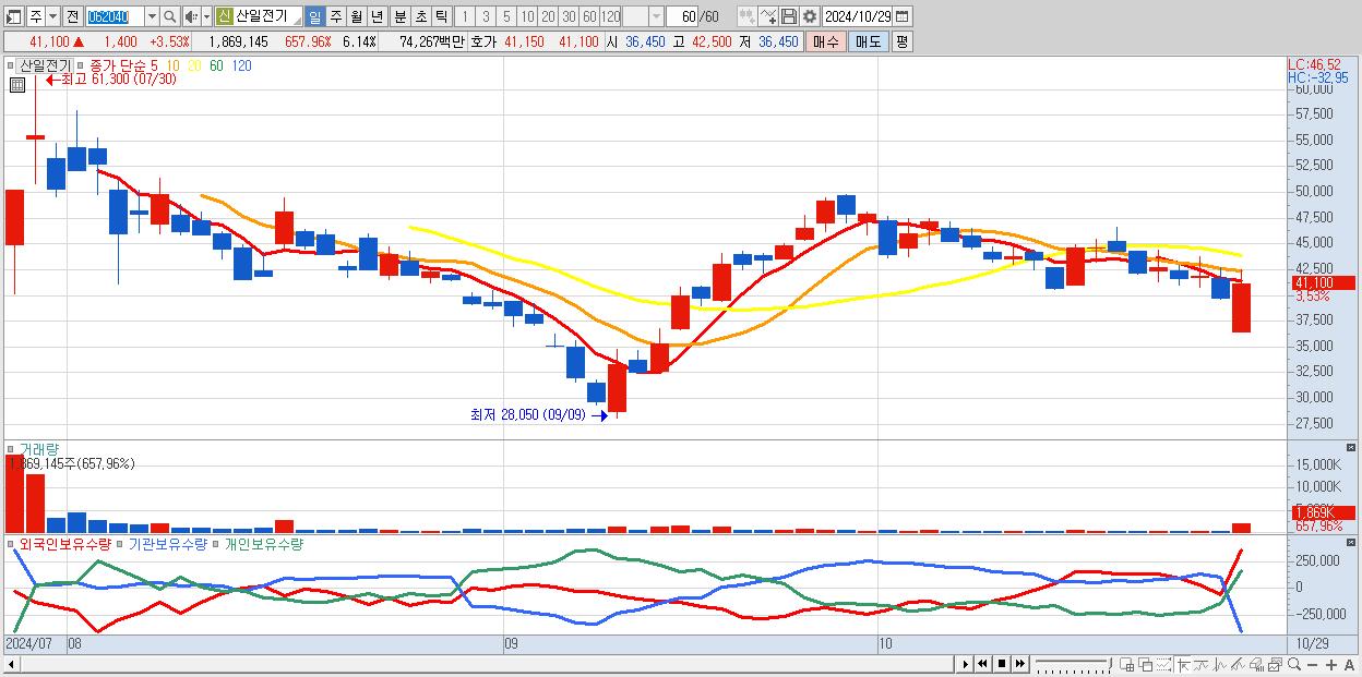 - 산일전기 (41,100원 ▲ 3.53% , 시총: 12,513억, 외국인 순매수 거래금:118억)