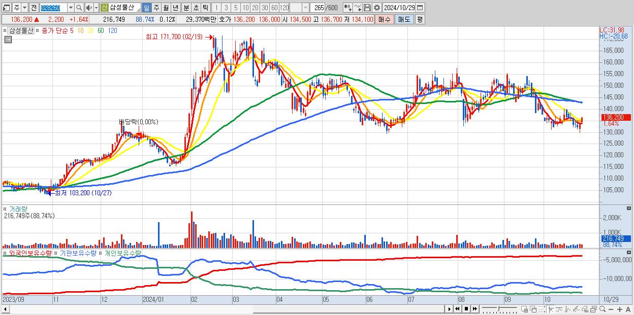 - 삼성물산 (136,200원 ▲ 1.64% , 시총: 242,142억, 외국인 순매수 거래금:52억)