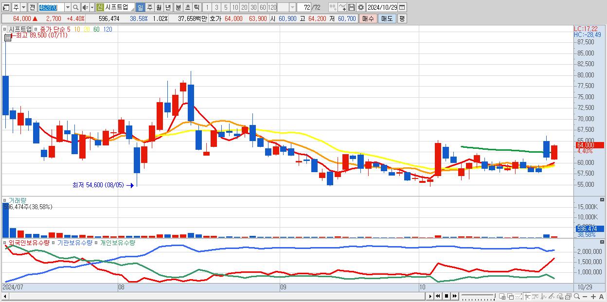 - 시프트업 (64,000원 ▲ 4.4% , 시총: 37,334억, 외국인 순매수 거래금:69억)