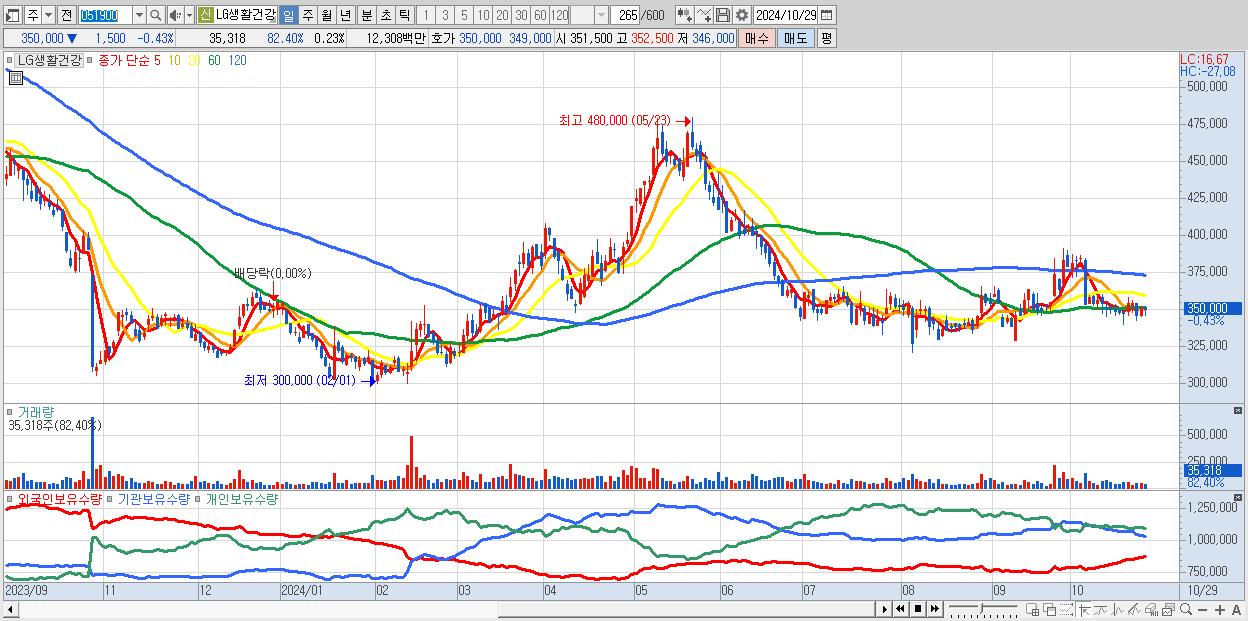 - LG생활건강 (350,000원 ▼ -0.43% , 시총: 54,664억, 외국인 순매수 거래금:39억)