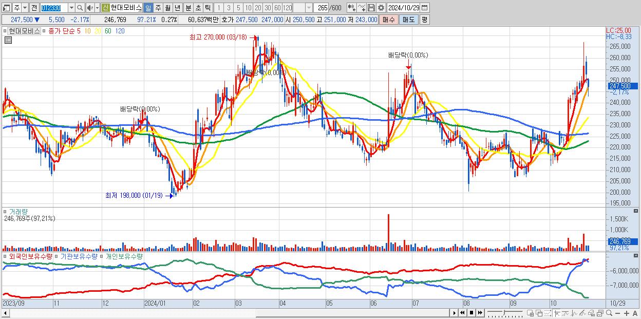 - 현대모비스 (247,500원 ▼ -2.17% , 시총: 230,163억, 외국인 순매수 거래금:120억)