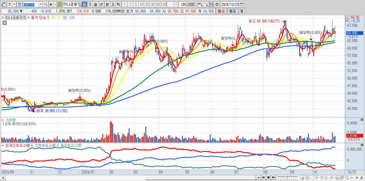 - 하나금융지주 (65,000원 ▼ -0.61% , 시총: 186,707억, 외국인 순매수 거래금:50억)