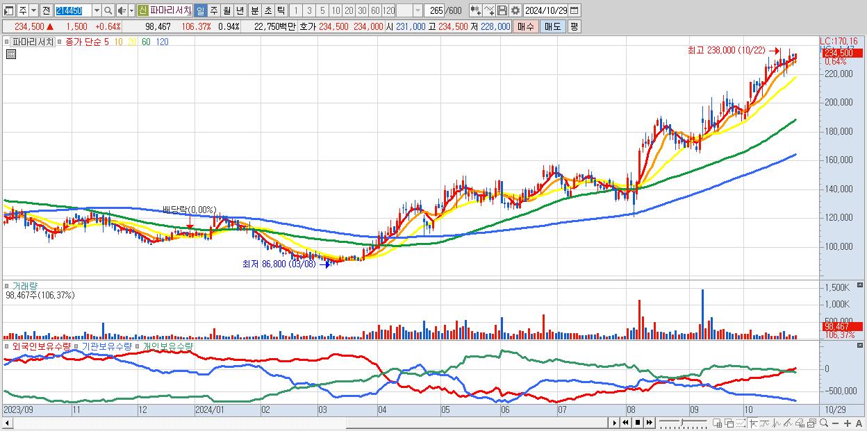 - 파마리서치 (234,500원 ▲ 0.64% , 시총: 24,618억, 외국인 순매수 거래금:63억)