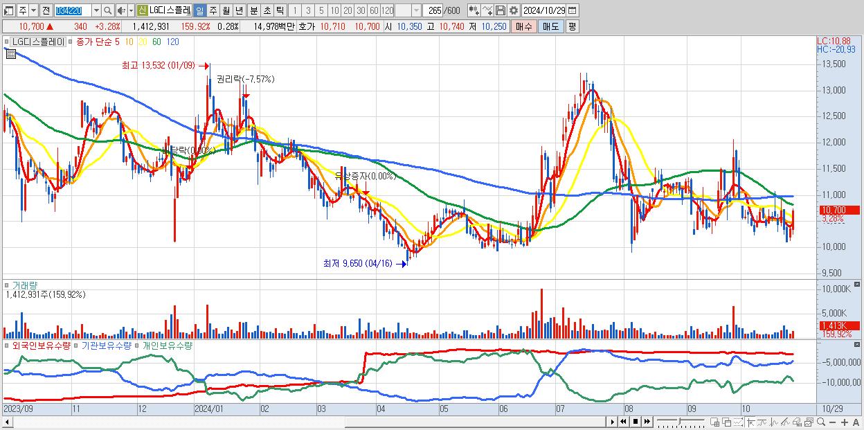 - LG디스플레이 (10,700원 ▲ 3.28% , 시총: 53,500억, 외국인 순매수 거래금:52억)