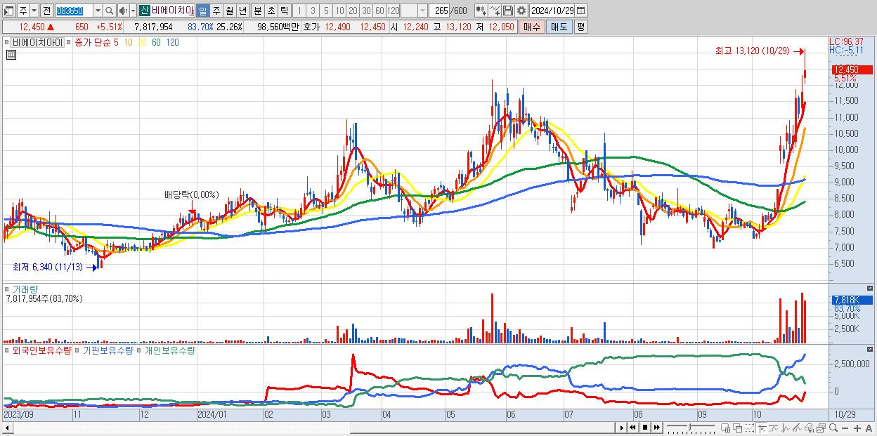 - 비에이치아이 (12,450원 ▲ 5.51% , 시총: 3,853억, 외국인 순매수 거래금:44억)