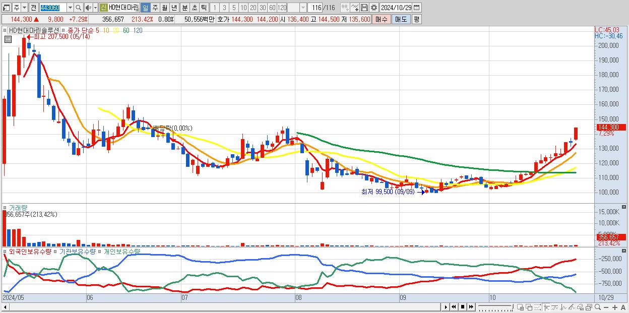 - HD현대마린솔루션 (144,300원 ▲ 7.29% , 시총: 64,141억, 외국인 순매수 거래금:50억)