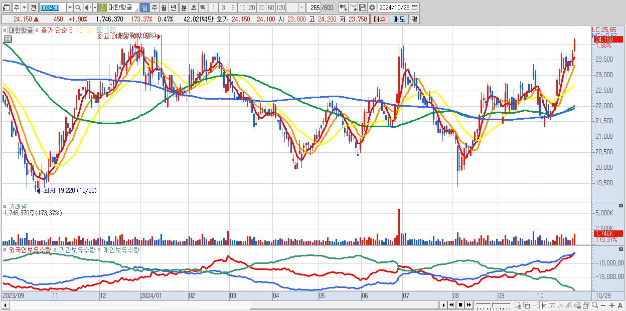 - 대한항공 (24,150원 ▲ 1.9% , 시총: 88,925억, 외국인 순매수 거래금:94억)