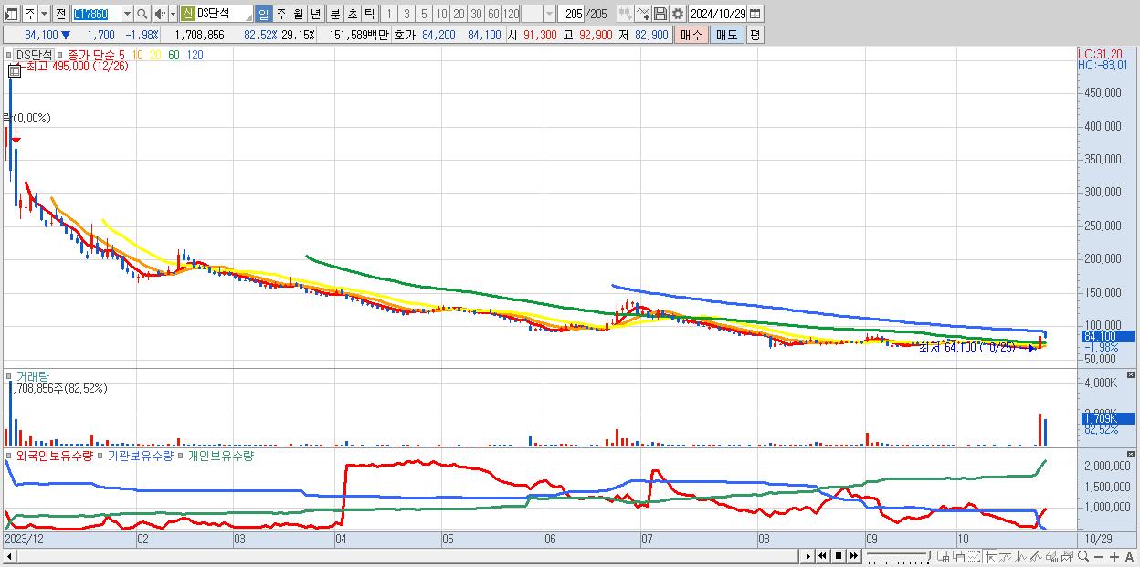 - DS단석 (84,100원 ▼ -1.98% , 시총: 4,929억, 거래량: 1,708,856, 거래대금:1,516억)