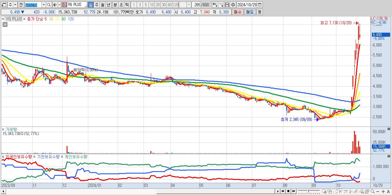- YG PLUS (6,490원 ▼ -6.08% , 시총: 4,117억, 거래량: 15,343,738, 거래대금:1,018억)