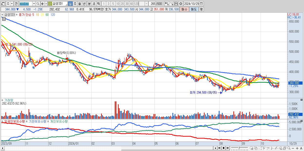 - 삼성SDI (344,000원 ▼ -1.29% , 시총: 236,550억, 거래량: 282,432, 거래대금:966억)