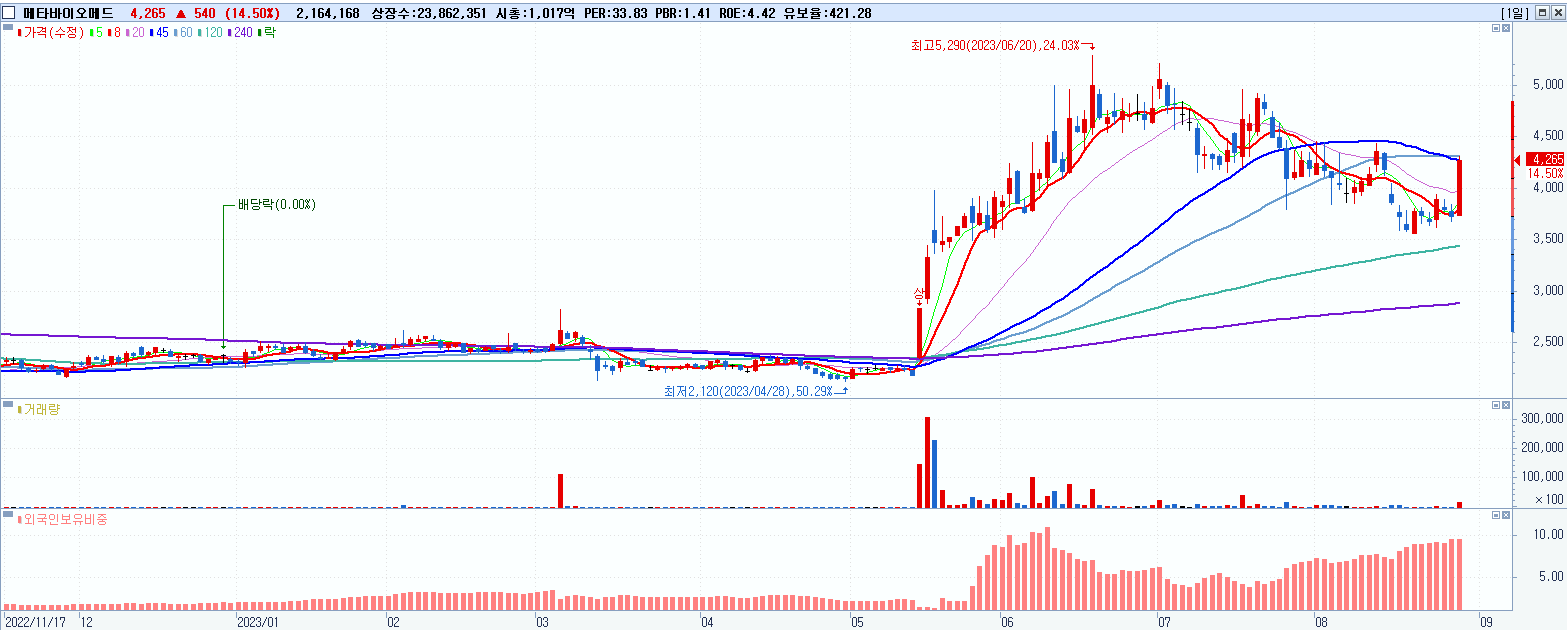 - 메타바이오메드 (4,265원 ▲ 14.5% , 시총: 1,018억, 거래량: 2,164,185, 거래대금:89억)