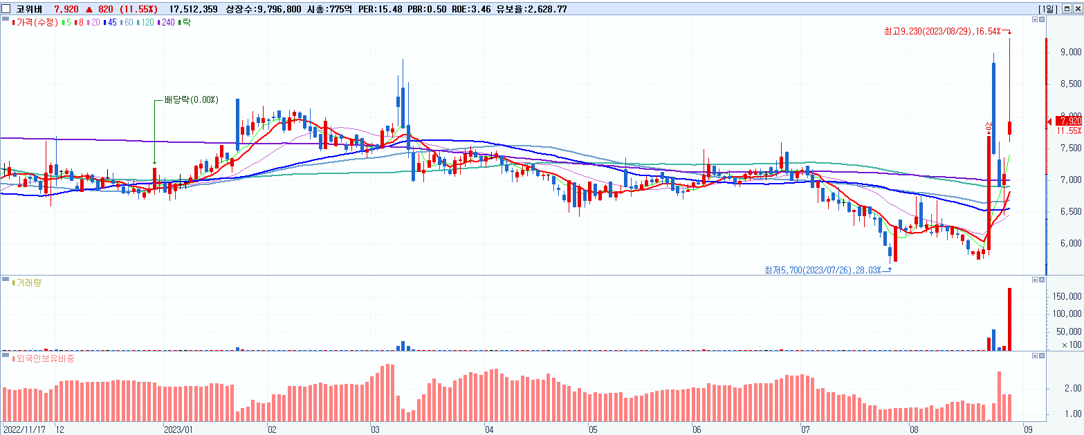 - 코위버 (7,920원 ▲ 11.55% , 시총: 776억, 거래량: 17,525,875, 거래대금:1,496억)
