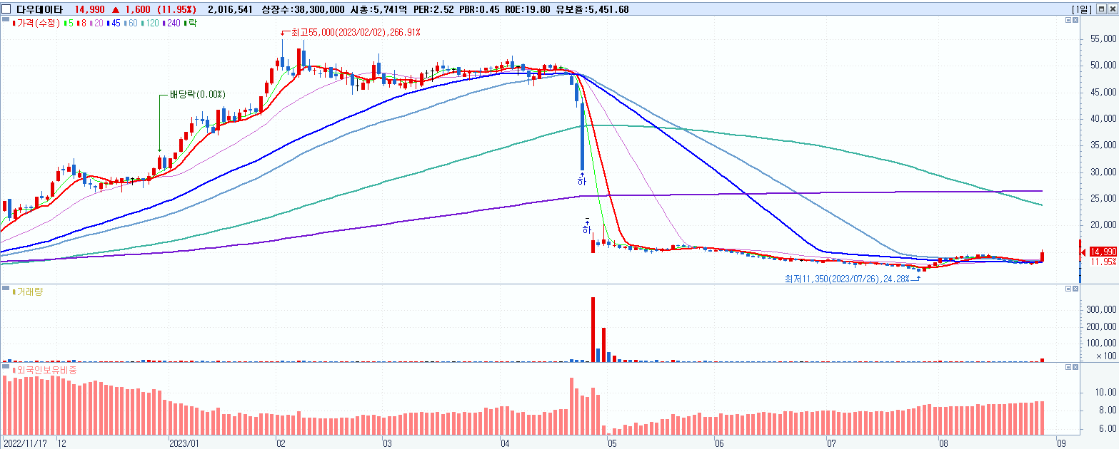 - 다우데이타 (14,990원 ▲ 11.95% , 시총: 5,741억, 거래량: 2,017,002, 거래대금:300억)