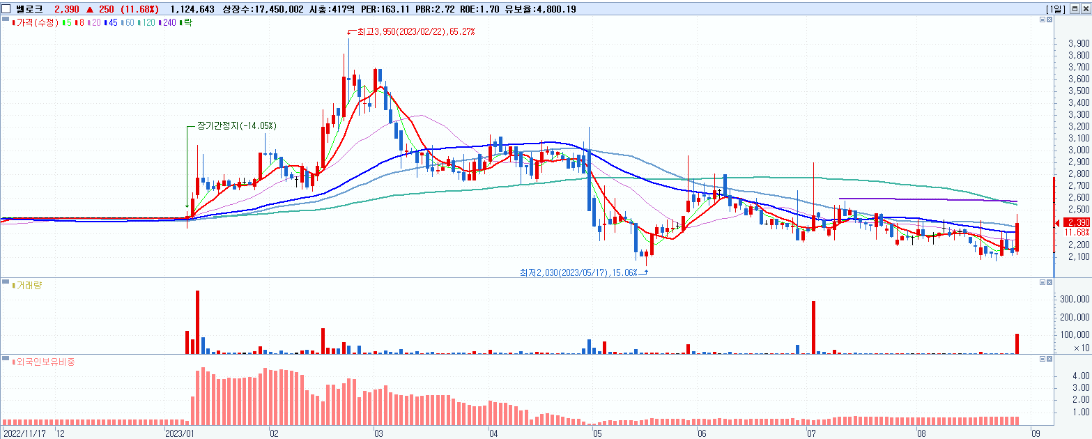 - 벨로크 (2,390원 ▲ 11.68% , 시총: 417억, 거래량: 1,124,647, 거래대금:26억)