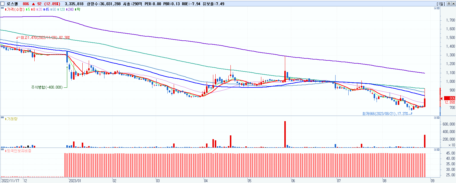 - 로스웰 (806원 ▲ 12.89% , 시총: 290억, 거래량: 3,336,418, 거래대금:28억)