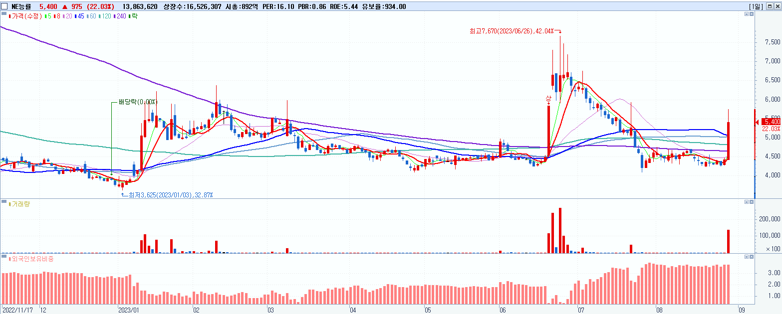 - NE능률 (5,400원 ▲ 22.03% , 시총: 892억, 거래량: 13,893,087, 거래대금:757억)