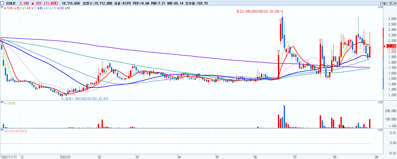- 유비온 (2,100원 ▲ 11.82% , 시총: 414억, 거래량: 10,718,369, 거래대금:232억)