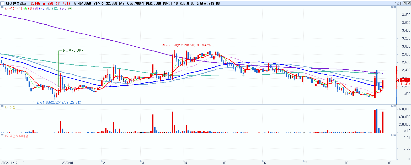 - 아이윈플러스 (2,145원 ▲ 11.43% , 시총: 701억, 거래량: 5,456,327, 거래대금:114억)