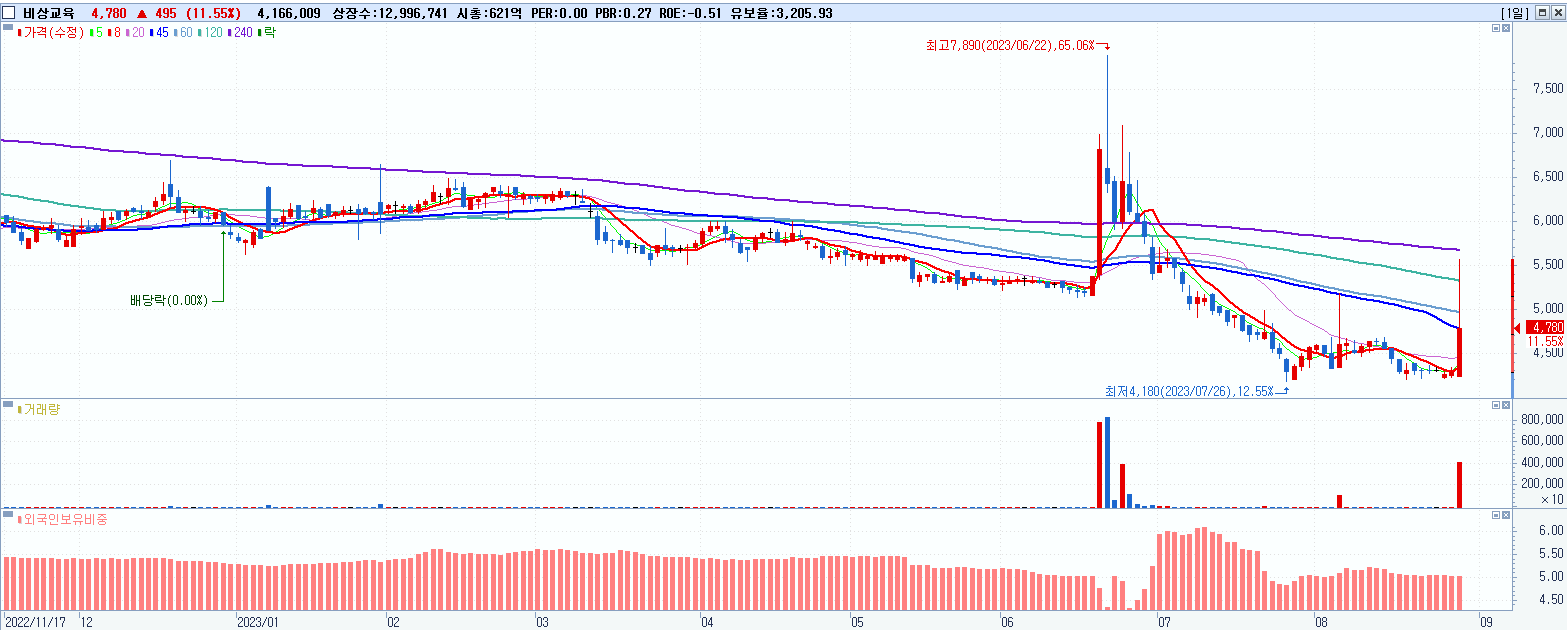 - 비상교육 (4,780원 ▲ 11.55% , 시총: 621억, 거래량: 4,169,298, 거래대금:216억)