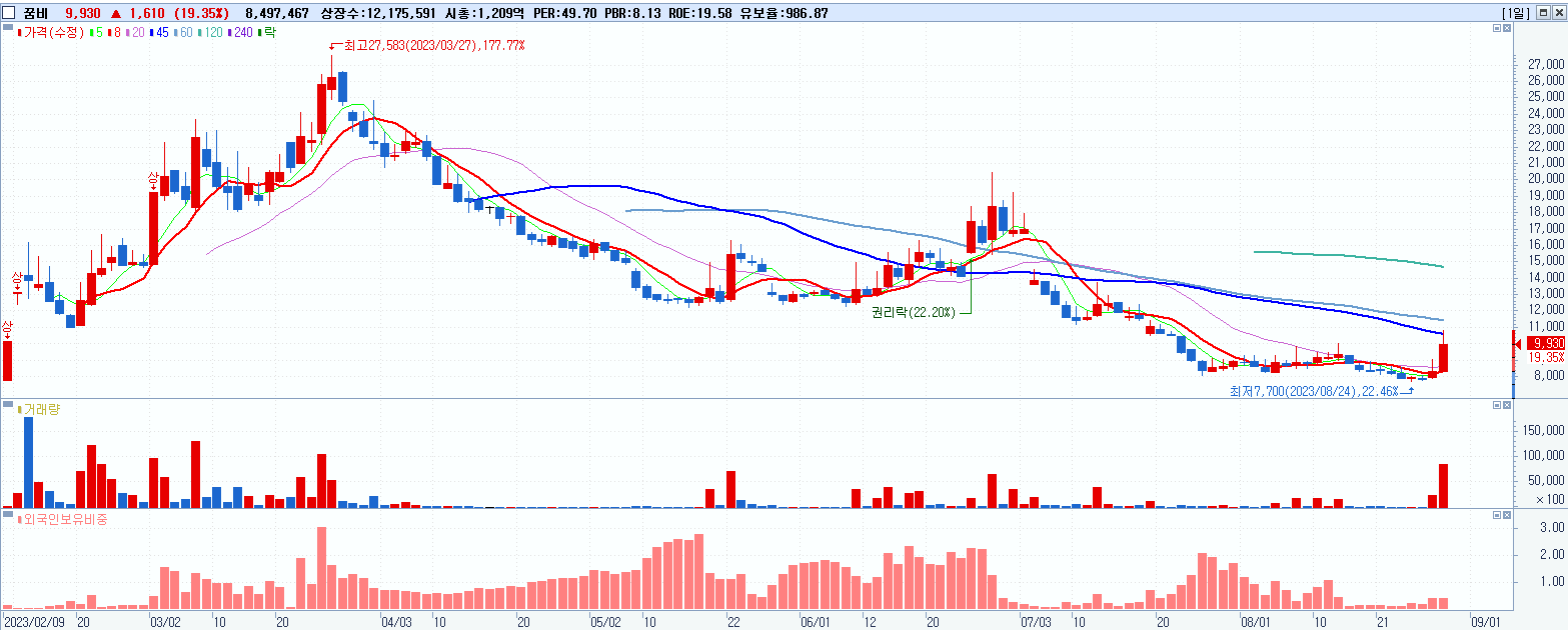 - 꿈비 (9,930원 ▲ 19.35% , 시총: 1,209억, 거래량: 8,500,690, 거래대금:854억)
