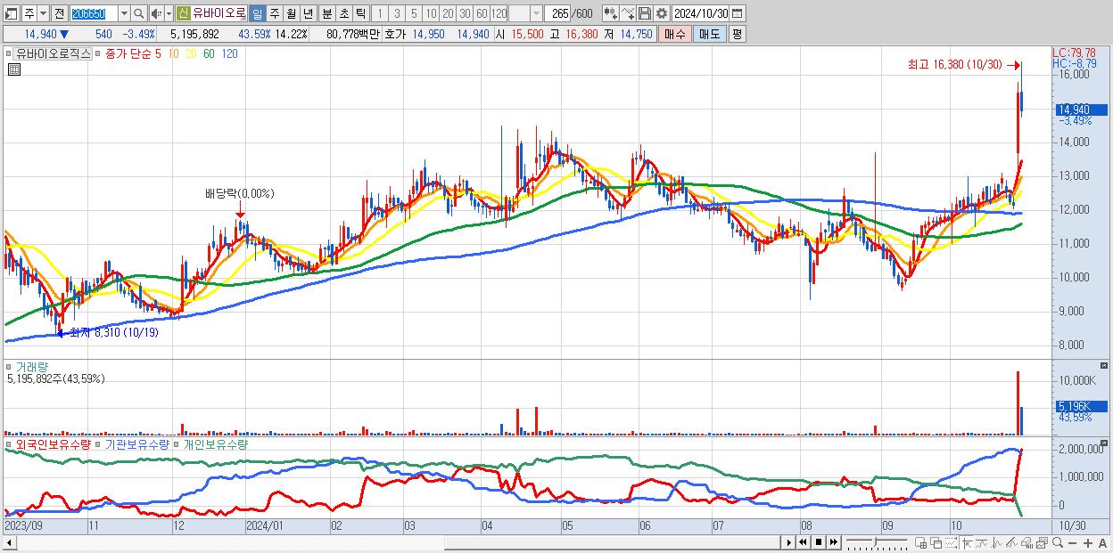 - 유바이오로직스 (14,940원 ▼ -3.49% , 시총: 5,458억, 외국인 순매수 거래금:52억)