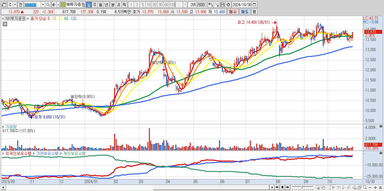 - NH투자증권 (13,870원 ▲ 2.36% , 시총: 45,423억, 외국인 순매수 거래금:43억)