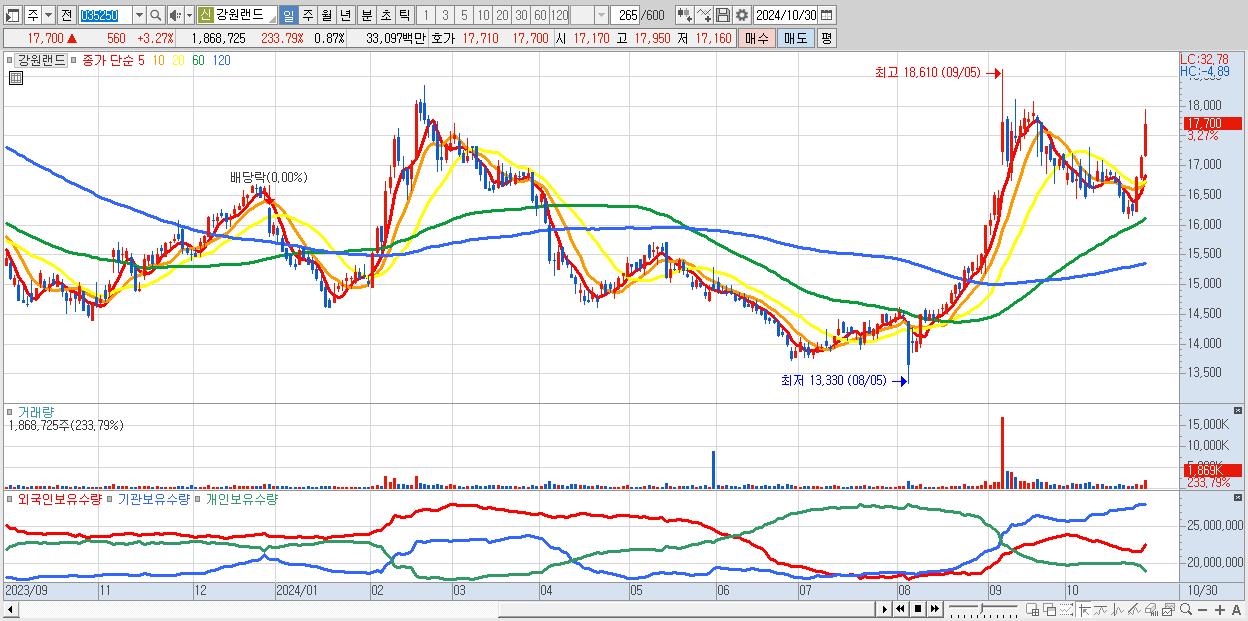 - 강원랜드 (17,700원 ▲ 3.27% , 시총: 37,867억, 외국인 순매수 거래금:119억)